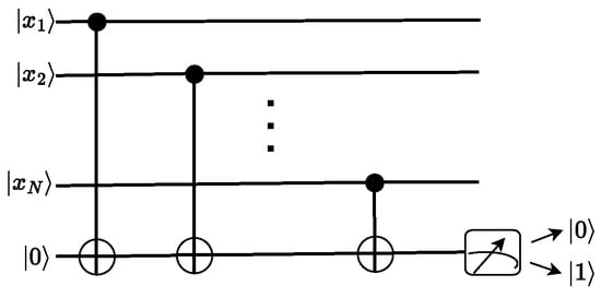 A quantum circuit representing a solution to the N-bit parity problem. N qubits encode the Boolean input , and N CNOT gates act on an ancilla qubit, which registers the output.