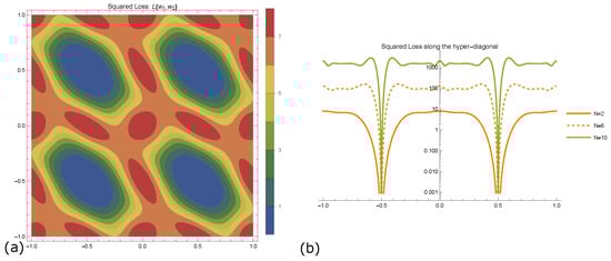 We initially employ the square loss function for evaluating the result of the learning procedure of the VQC; however, we observe that no local minima appear in this case. The solution landscape for can be seen in Figure 3a over two periods. Since illustrations of the landscape’s morphology can only be extracted as cross-sections when , we plot an example for and 10, where the cross-section is applied along the principal hyper-diagonal, namely, where , shown in Figure 3b. We notice that, as N increases, the number of local minima along the diagonal increases moderately. Nonetheless, the existence of local minima persists if for some inputs. This suggests that the number of minima within a period increases at least linearly with N, while the global solution remains unique.