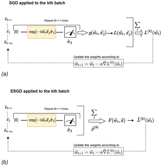 (a) SGD: A schematic depiction for the evaluation of the gradient via the SQC, defined by Equation (1), using the kth batch of the input. For an analytic evaluation of , the whole procedure needs to be repeated, measuring the observable (instead of ) so that of Equation (8) is estimated as well. (b) ESGD: The batch is treated as an ensemble and, contrary to SGD, the measurement outcomes are first averaged out over the batch to estimate and then used as inputs in the loss . DSGD is represented by sub-figure (b) for .