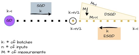 A schematic view of the four gradient optimization methods employed in this work: GD, SGD, ESGD, and DSGD. SGD is presented by a dotted (black) line indicating the number k of batches with (see Equation (10)). For , SGD reduces to GD. ESGD is indicated as a dotted (orange) line, where k is now decreasing from left to right. For , ESGD coincides with SGD. Above ESGD there is a (yellow) trapezoidal area describing DSGD, which depends on k but also on the number M of measurements per input. With increasing M, DSGD approaches ESGD, while this convergence is faster (with M) when the number of batches is small. The direction of the arrows in the figure shows the direction of increase for the respective value.