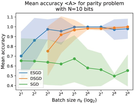 From Figure 6, it is evident that both ESGD and DSGD outperform SGD for all batch sizes. Specifically, the mean accuracy of ESGD and its stochastic counterpart, DSGD, increases as the batch size grows, whereas SGD experiences a mild performance degradation, as shown in Figure 4. SGD eventually converges to the performance of GD (see Table 1 for ). The close relationship between SGD and ESGD for is also apparent, with both showing poor performance due to the continuous, uncorrelated treatment of the data, which fails to collectively guide the weight vector toward a solution. In contrast, ESGD consistently achieves high accuracy, close to 100%, for any . DSGD, being stochastic, does not easily achieve 100% accuracy, as it tends to oscillate even once average convergence is reached.