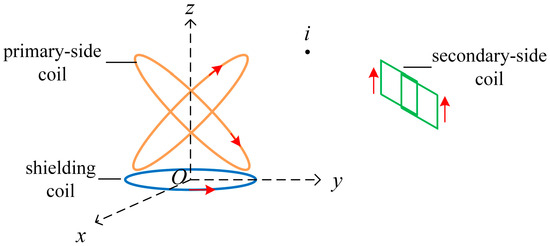 L0, so theoretically the method proposed in this paper is still applicable. To study the magnetic shielding effect of the system when the electrical equipment deviates from the charging center, so that the secondary-side coil is offset at a maximum angle of 90° clockwise relative to the primary-side coil along the
