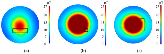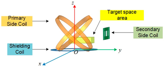 Figure 14 shows that the maximum magnetic induction intensity in the target space becomes larger when the secondary side coil is offset systematically. When the secondary side coil is offset by 45° and 90°, respectively, and the shielding coil takes the optimal inductance, the maximum magnetic induction intensity in the target space region is 22.56 μT and 23.78 μT, respectively. The magnetic induction intensity in the target space region meets the safety standard of 27 μT.