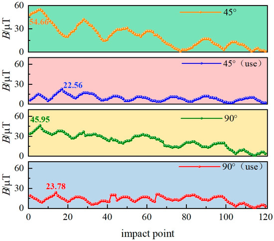 SEavg of the magnetic induction intensity in the target space region at the deviation of the secondary side coil at 45° and 90° are calculated, respectively. Substituting the value of the magnetic induction intensity in the target space area at the angle offset of the secondary side coil into Equation (33), the values in