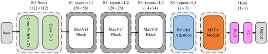 The core architecture of MSF-MaxViT is the MaxViT model, which demonstrates powerful global and local feature extraction capabilities in vision tasks by combining convolutional operations with the Transformer’s self-attention mechanism. The MaxViT architecture employs a multi-scale-based feature extraction scheme that aims to capture both detailed information and the macroscopic structure of an image. However, MaxViT still has some limitations in feature fusion and information flow, especially in the fusion of local and global information. Therefore, this study improves MaxViT by introducing Parallel Attention and MSFA modules to enhance its feature learning capability.