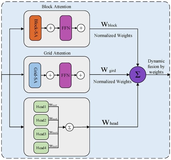 Dynamic Weight Fusion: In Parallel Attention, the outputs of Grid and Block Attention, as well as the results of multi-head attention, are fused through dynamic weights. Specifically, learnable weight parameters are assigned to each branch (including Grid, Block, and Multihead Attention). In this way, the model is able to automatically learn the importance of each attention module in a particular task, thus optimizing the information fusion process. The framework of Parallel Attention is shown in Figure 2.