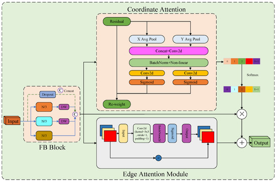Edge Attention Module: The core of the design of the Edge Attention Module is designed to enhance the perception of edge features in the spatial domain. Firstly, a convolutional kernel of 3 × 3 is used to perform a convolutional operation on the input features to capture the local edge features, thus achieving spatial weighting. Subsequently, the convolution results are normalized using Batch Norm to stabilize the training process and accelerate model convergence. Finally, a Sigmoid activation function is used to nonlinearly map the feature maps to generate weight distributions based on the edge information. The aim of this module is to improve the model’s perception and representation of edge information, thus improving its ability to portray detailed features.