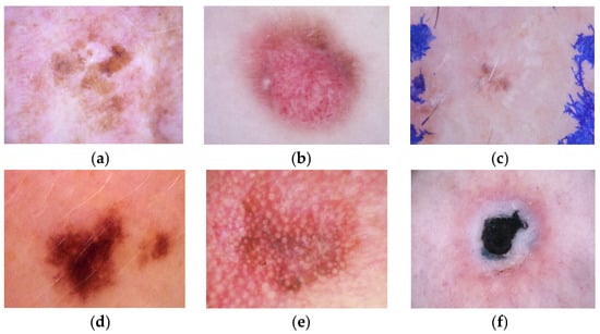 HAM10000 Image: (a) ISIC_0027419: bkl; (b) ISIC_0033603: mel; (c) ISIC_0031263: bcc; (d) ISIC_0029624: nv; (e) ISIC_0031228: akiec; (f) ISIC_0033749: vasc.