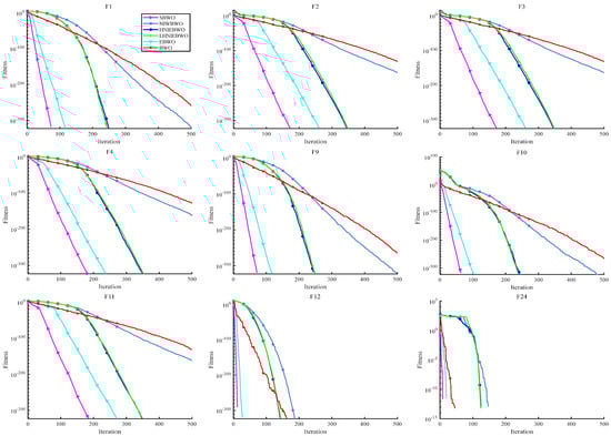 This experiment evaluates different versions of the BWO algorithm used to confirm the efficiency of every enhancement. Specific results are shown in Table 2. The base model BWO is the original BWO algorithm, which serves as a benchmark for comparison. The SBWO is the best model that combines several improvements (e.g., quadratic interpolation strategy, nonlinear inertia weight factors, etc.) and represents the final performance of the algorithm. In the ablation experiment charts, Enhanced Beluga Whale Optimization (EBWO), Hybrid Nonlinear Inertial Enhanced Beluga Whale Optimization (HNIEBWO), Latin Hypercube Nonlinear Inertial Enhanced Beluga Whale Optimization (LHNIEBWO), Nonlinear Inertial Weighting Beluga Whale Optimization (NIWBWO), and Improved Beluga Whale Optimization (IBWO) are all intermediate models that introduce different improvements step by step, demonstrating the impact of each improvement individually on the algorithm’s performance. Among these methods, EBWO improves the search accuracy by introducing a quadratic interpolation strategy; HNIEBWO combines nonlinear inertial weighting factors to further balance global exploration and local exploitation; LHNIEBWO initializes the population using Latin Hypercubic Sampling, which increases the diversity of the population; whereas NIWBWO improves the search by enhancing the nonlinear inertial weighting factors’ stability during the process. IBWO further balances population diversity and convergence speed throughout the exploration and development phases by introducing an adaptive tuning strategy and adjusting inertia weights. The combination of these strategies enables SBWO to avoid local optima more effectively and improve optimization performance. By comparing models such as BWO and SBWO, one can clearly see the contributions of each algorithmic improvement in solving the optimization problem.