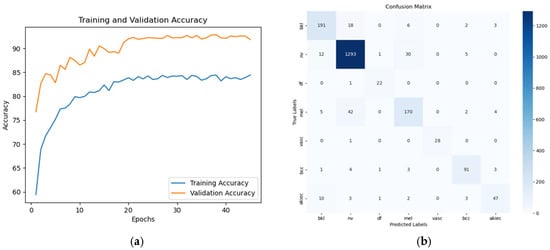 Figure 7b shows the confusion matrix, which shows how the model’s predictions on each category compare with the true labels. As can be seen in the figure, most of the categories are very accurate, especially the category ‘nv’, which has a high prediction accuracy of 1293 correct predictions with almost no misclassification. Other categories, such as ‘bkl’ and ‘mel’, also have high classification accuracy, although there are some misclassifications (e.g., 18 misclassifications of ‘bkl’ to ‘nv”). By analyzing the confusion matrix, it is possible to visually assess the performance of the model on different skin lesion types, helping to improve the model’s classification ability.