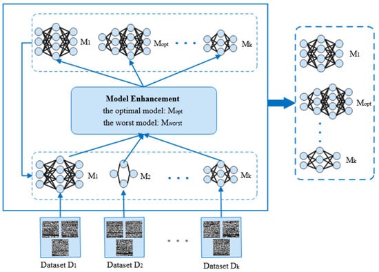 The core of the model enhancement method is a dynamic heterogeneous redundancy architecture. This architecture introduces multiple components with varying technologies or structures into the system and improves system reliability by dynamically allocating tasks to these components. The model enhancement approach for malware classification is illustrated in Figure 3.