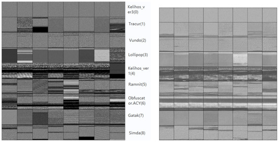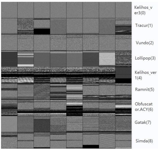 Malware executable files can be represented as binary strings of ‘0’ and ‘1’. This vector can be reshaped into a matrix and treated as an image; malware within the same family exhibits significant visual similarity in texture. To convert malware binary files into images, a given malware binary file is read as a vector of 8-bit unsigned integers, which is then organized into a two-dimensional array. This can be visualized as a grayscale image with pixel values ranging from [0, 255], where 0 represents black and 255 represents white. The width of the image is fixed, while the height may vary according to the file size. Figure 4 illustrates grayscale images generated from the binary files of nine families within the MMCC dataset.