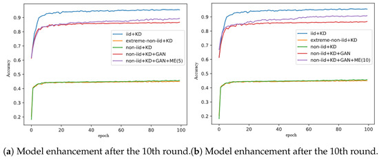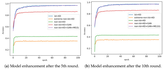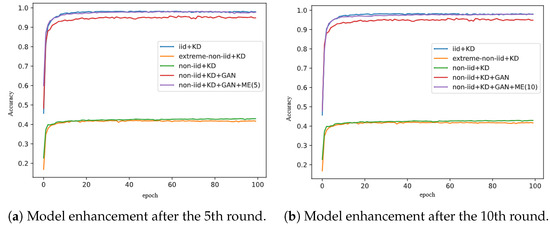 For the MMCC dataset, our experiment employed the malware classification experiment settings. Specifically, models with similar accuracy rates were selected as the malware classification models for individual clients, initiating model enhancement experiments after the fifth and tenth training rounds. Additionally, models with significantly differing accuracy rates were also chosen for this purpose, with the enhancement experiments commencing similarly.