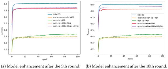 Regardless of whether model enhancement began after the fifth or tenth round, the proposed methods exhibited superior performance compared to non-iid + KD + GAN, even nearing the accuracy of iid + KD. This demonstrates the effectiveness of the methods in enhancing the performance of global malware classification models within distributed systems.