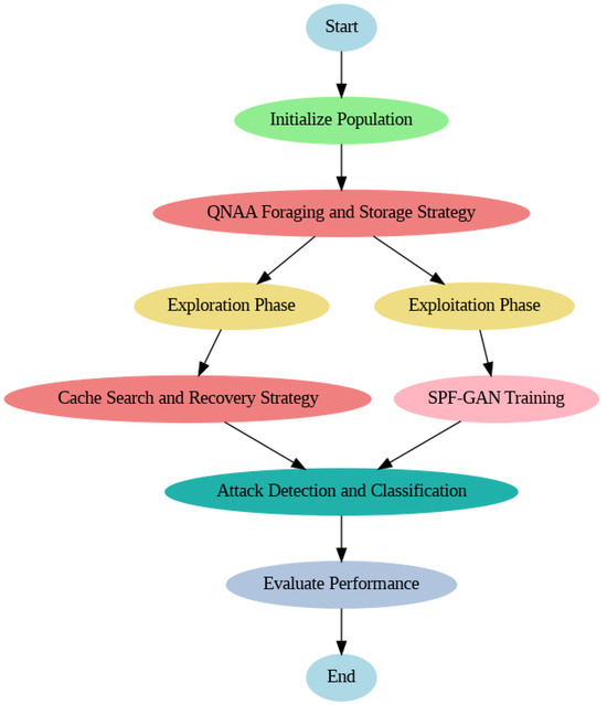 The critical innovations in the proposed security model are the QNAA and SPF-GAN components: Quantum-Inspired Neuro Attention Aggregation and Smart Packet Filtering–Generative Adversarial Network, respectively. The QNAA applies quantum-inspired techniques to improve the attention mechanism of the model so that it can efficiently focus on the most relevant characteristics within the data. This selective attention ensures efficient feature aggregation, which is key to identifying and classifying different network intrusion types effectively. The QNAA reduces noise and unrelated data that can cause false detections by focusing only on the most informative features, thereby improving the model’s precision and recall.