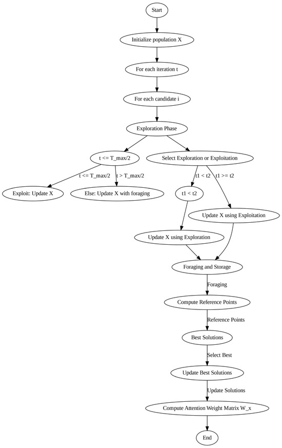 represents the individual candidate solution. Consequently, foraging and storing strategies are implemented, as shown in the following models:
