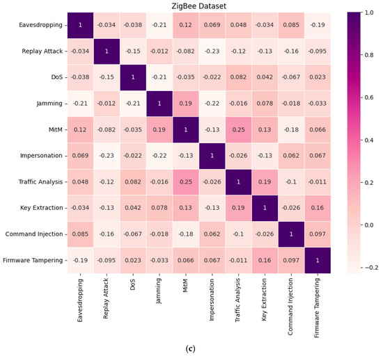 Figure 4c shows the inter-feature dependencies in the ZigBee dataset. ZigBee is a wireless communication protocol widely used in the IoT, and some of the typical datasets contain both normal and attacker environments. The heatmap also reveals the interconnection between several features, including packet loss, signal interferences, and transmission delays, which are relevant to identifying a network’s anomalous behavior and identifying attackers in ZigBee.