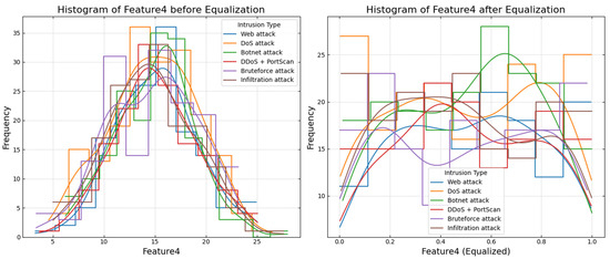 Figure 5, histogram equalization is performed to visualize the impact of transformation on the dataset by comparing features before and after transformation. The initial histogram of the data presents the distribution of pixel or feature values in the dataset. In some cases, before equalization, the data may be poorly contrasted, and their values are nonuniformly distributed, where classes of values are either over- or under-represented. This could lead to a biased representation that worsens the ability of the data to effectively represent patterns or features. Histogram equalization post-processing adjusts the distribution of data values to enhance contrast. The equalized histogram will have an even spread of values across the entire range, with the purpose of maximizing contrast between different regions in the data. This adjustment is very useful for highlighting subtle differences and substantially improving the visibility of patterns or anomalies in a data field.