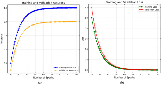 Figure 6 presents the training and validation accuracy of the proposed security model at different epochs. The accuracy curves are good; they represent how the model is performing and whether it is overfitting from the training dataset on the validation dataset. At the start of the epoch, the training and validation accuracy slowly increase, because the model is learning the relationships between the features and target values in the training dataset and similar relationships in the validation dataset. During the training process, the model reaches a certain level of accuracy on the testing data at which re-training only slightly affects the overall accuracy. The difference between the training and validation accuracy will give an indication of whether overfitting or underfitting has occurred. Close training and test errors imply that the model of choice is generalizing well, while a large discrepancy implies overfitting. The QNAA (Quantum-Inspired Neuro Attention Aggregation) and SPF-GAN (Smart Packet Filtering–Generative Adversarial Network) are important in this process, as they enable the model to pay close attention to the most vital features and filter out trivial information to improve the model’s performance and powers of observation.