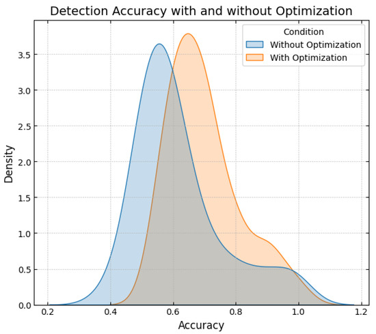 Figure 7 shows the detection accuracy of the proposed model with and without optimization. The non-optimized model does not include the QNAA and SPF-GAN; when integrated with them, it becomes the optimized model. From the findings, it is evident that the optimized model has superior efficiency in the identification of intrusions in various attack situations. This shows that, with the help of the QNAA and SPF-GAN, the model’s performance can be improved in terms of accurately detecting and classifying network intrusions. The QNAA component can also assist with the collecting of features based on attention mechanisms that enable the model’s selective perception of data. At the same time, the SPF-GAN improves the filtering process to select high-quality data as the model’s training set, which greatly improves the detection effect.