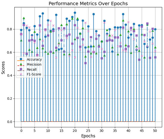 Figure 8 provides a comprehensive analysis of the proposed model’s performance using key evaluation metrics: precision, recall, accuracy, and F1-score. Precision is the ratio of true positives to total positives, which shows how well the model limits false positives. In contrast, recall determines the model’s ability to correctly identify positive cases, measured by the ratio of true positives to actual positives.