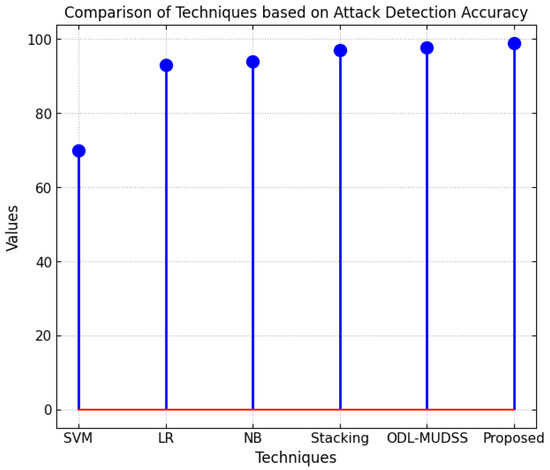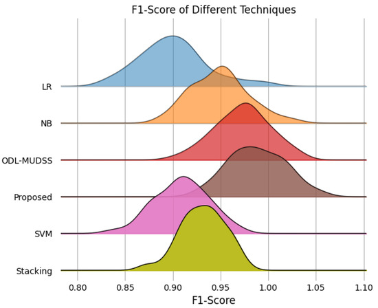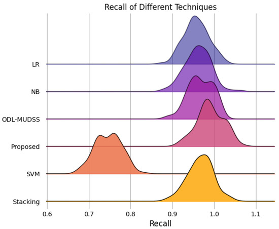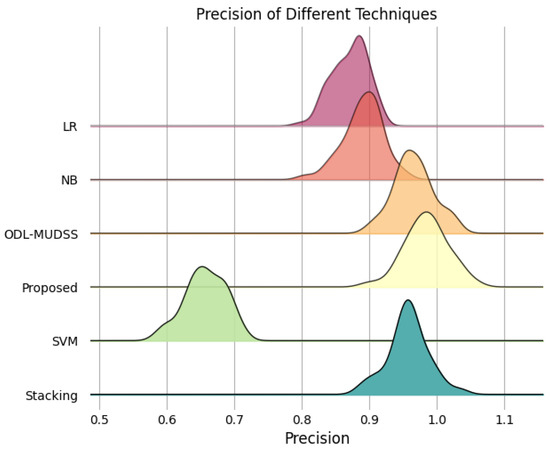 Figure 10. The values of precision, depicted as a normal distribution for the sake of defining the model, are presented as follows: SVM provides a precision of about 0.66, LR 0.87, NB 0.89, Stacking 0.96, and ODL-MUDSS 0.97, while the new model is 0.989. Precision quantifies how many of the model’s positive predictions are actually positive and is higher for a model with fewer false positives. In