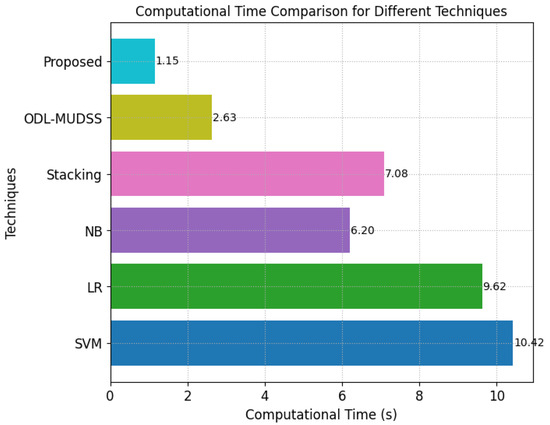 Figure 13 indicates the computational time of the different methods for analyzing the CRN Jamming dataset. The computational times for SVM, LR, NB, Stacking, ODL-MUDSS, and the proposed model are approximately 10.42, 9.62, 6.20, 7.08, 2.63, and 1.15 s, respectively. The proposed model also shows the fastest processing time and is markedly better than other approaches. This efficiency is due to the optimal algorithms for chosen feature selection and the integration of the QNAA and SPF-GAN models, which significantly reduce the time required to filter the data. The decrease in computation time is valuable for applications where the immediate identification of a jamming attack is critical. Thus, the proposed model accelerates the analysis, while maintaining high accuracy and reliability, for the intended application of network security systems.