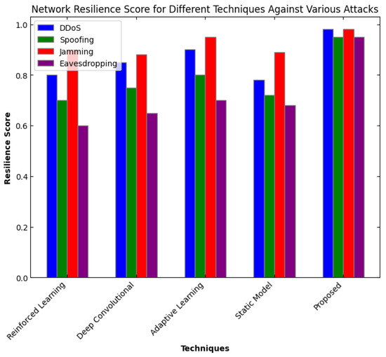 Figure 14. The compared techniques included Reinforced Learning, Deep Convolutional, Adaptive Learning, a Static Model, and the proposed model. The resilience scores for each technique against these attacks are as follows: Reinforced Learning obtains scores of 0.8 for DDoS, 0.7 for Spoofing, 0.9 for Jamming, 0 for Mailing Lists, and 0.6 for Eavesdropping. The Deep Convolutional technique attains a performance of 0.85 for DDoS, 0.75 for Spoofing, and 0.88 for Jamming. Adaptive Learning demonstrates high scores of 0.9 for DDoS, 0.8 for Spoofing, 0.95 for Jamming, 0 for Feedback, and 0.7 for Eavesdropping. The Static Model obtains values of 0.78 for DDoS, 0.72 for Spoofing, and 0.0 for Jamming. To integrate the communication ability rating, a scale from 0 to 89 is set for Jamming.