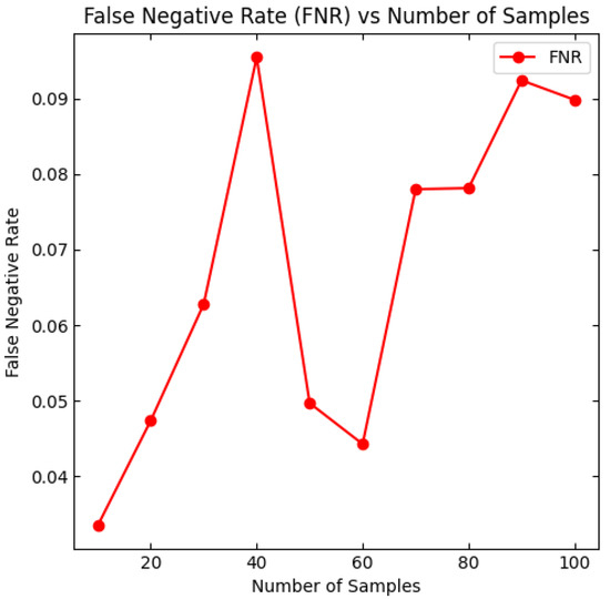 Figure 15 presents the analysis of the variation in the FPR when the number of samples varies between 10 and 100. Initially, there is some fluctuation, as the dataset has few samples for training and testing; however, with increasing data, it stabilizes to a zero false alarm rate. This establishes the proposed model as a robust one, as it maintains a low FPR. Thus, the results confirm that the proposed approach is able to minimize false positives while ensuring a high detection accuracy rate. The false negative rate (FNR) is defined as the ratio of actual attacks that are mistakenly predicted as normal activity; this in itself implies a failure to detect real threats. In most security applications, a high FNR is unacceptable, as it increases the risk of undetected intrusions, which may also cause damage to the network infrastructure.