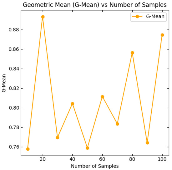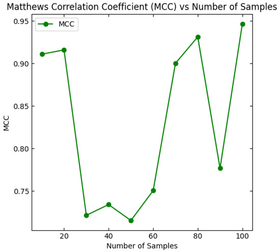 Figure 17 shows the MCC values for all sample sizes of the proposed method. The results always indicate a high classification performance. When there are few samples, one sees small fluctuations in the MCC because of the small amount of training data, which may cause fluctuations in the quality of predictions. With the increase in the number of samples, the MCC continues to improve, meaning that the model becomes stabler and more precise in predicting.