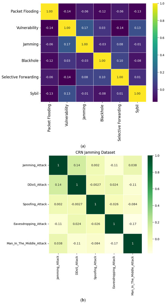 Thus, through specifying these features, the proposed intrusion detection model can focus on them during the detection phase, which will result in high accuracy and efficiency in intrusion detection. Figure 4a,b zoom in on the CRN Jamming dataset, which aims at reproducing the nature of jamming attacks in CRNs. The heatmap reveals the relations between the features that are most useful in identifying the given jamming activities. This means that, by studying these correlations, the proposed model will be able to better fathom the behaviors underlying jamming to differentiate between normal and malicious activity. Such specificity improves the model’s capacity to accurately identify and combat jamming attacks, even in the more challenging and constantly evolving environment of CRNs. The correlation heatmap in Figure 4c shows the inter-feature dependencies in the ZigBee dataset. ZigBee is a wireless communication protocol widely used in the IoT, and some of the typical datasets contain both normal and attacker environments. The heatmap also reveals the interconnection between several features, including packet loss, signal interferences, and transmission delays, which are relevant to identifying a network’s anomalous behavior and identifying attackers in ZigBee.