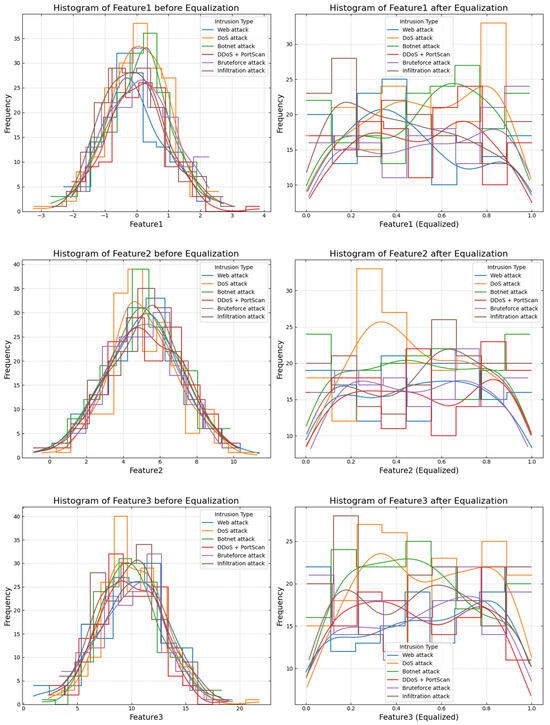 As shown in Figure 5, equalization is a method that increases the contrast in an image or dataset, making the distribution of pixel values equally likely across the range of intensities. In the context of Figure 5, histogram equalization is performed to visualize the impact of transformation on the dataset by comparing features before and after transformation. The initial histogram of the data presents the distribution of pixel or feature values in the dataset. In some cases, before equalization, the data may be poorly contrasted, and their values are nonuniformly distributed, where classes of values are either over- or under-represented. This could lead to a biased representation that worsens the ability of the data to effectively represent patterns or features. Histogram equalization post-processing adjusts the distribution of data values to enhance contrast. The equalized histogram will have an even spread of values across the entire range, with the purpose of maximizing contrast between different regions in the data. This adjustment is very useful for highlighting subtle differences and substantially improving the visibility of patterns or anomalies in a data field.