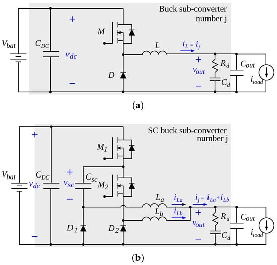 Figure 1a shows the most common architecture for a single-switch buck sub-converter. Note that, in this particular case, a passive output damping net ( and elements) is included to improve the poor damping factor that results when connecting the converter to an almost purely inductive load [3].