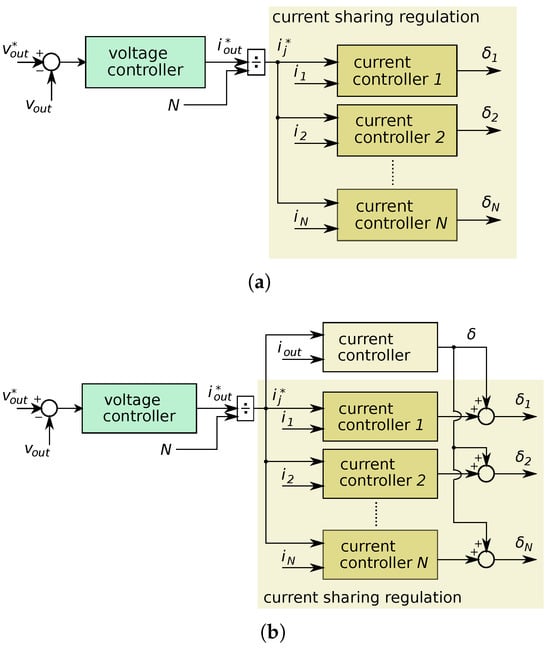 Regulation approaches with cascaded voltage and current closed-loop controllers are the most popular for regulating interleaved DC/DC converters [25]. Here, the external loop (voltage) dynamics need to be set, at least with a settling time ten times slower than the ones of the inner loops (current). A variety of configurations can be implemented, for example, the ones depicted in Figure 2, where current sensing per each sub-converter is mandatory.