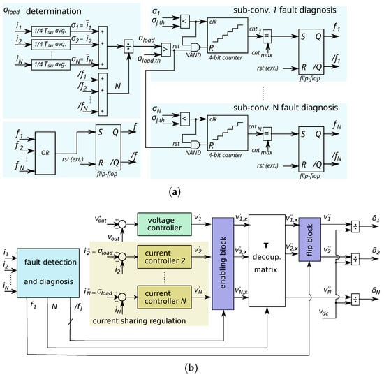 Block diagram of the proposed controller: (a) fault detection and diagnosis algorithm; (b) fault-tolerant voltage and current balancing algorithm including the fault detection block.