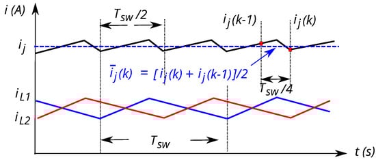 The algorithm borrows ideas from well-known current-based techniques, proposed for voltage source inverters [30,31]; however, in this case, the analysis of DC signals is easier than that of three-phase AC signals. The proposed closed-loop controller and PWM blocks are computed once at each period. As the algorithms have been implemented in an FPGA, it is possible to take advantage of the fast computational capabilities available. By oversampling each measured SC output current at each and applying a moving average filter for each modulation period , the averaged current values are obtained and provided to the closed-loop controller at each k-th sampling instant (Figure 5):