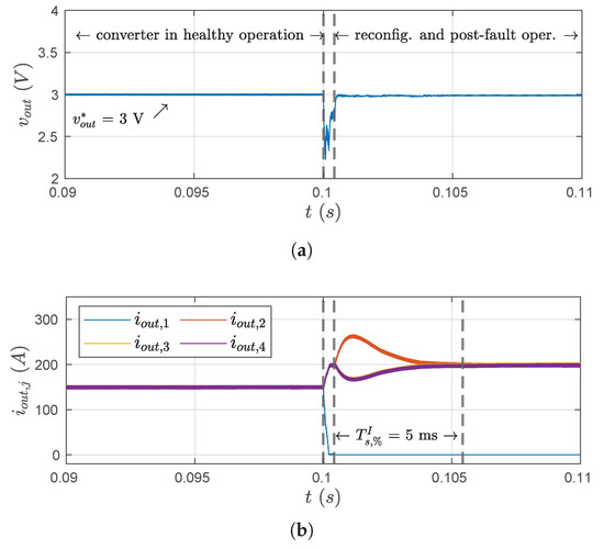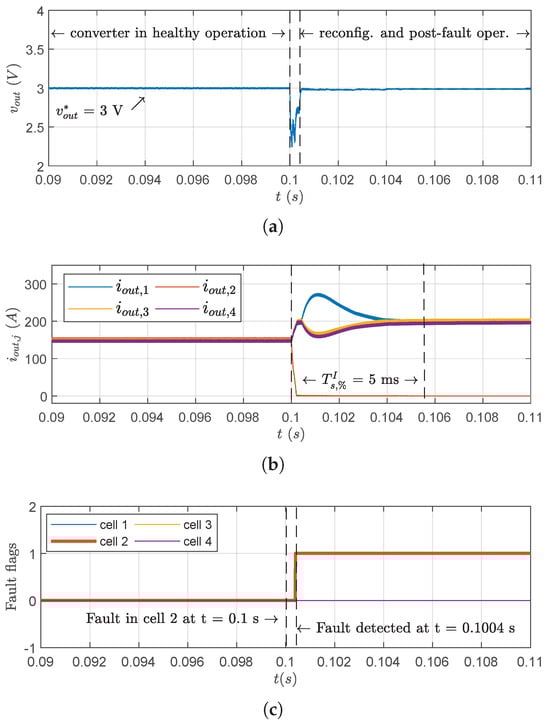 Two fault scenarios are studied; that is, when an open-circuit fault occurs within one of the current-regulated sub-converters, herein named slave cells, and when it occurs in the voltage-regulated one, herein named the master cell. The latter fault condition is illustrated in Figure 7, as it represents a more severe control situation (until reconfiguration, regulation capabilities are missing). An open-circuit fault is induced in switch of the master cell, at s, when V. As a result, quickly becomes zero, as is discharged. The currents of the healthy phases remain balanced due to the control action (Figure 8b). As expected, initially the output voltage does not track the reference (Figure 8a). However, considering the slow electromagnets’ powering dynamics, the fault detection and diagnosis algorithm quickly identify the faulty sub-converter (Figure 8c), and the closed-loop controller and the PWM module phase shifts are reconfigured on the fly. After a brief transient, the system’s performance is recovered, and it continues to operate in a sub-optimal manner. Figure 8 shows that almost equivalent fault detection, diagnosis, and post-fault operation results are obtained when the fault occurs in one of the slave cells (cell number 2, in this particular case).