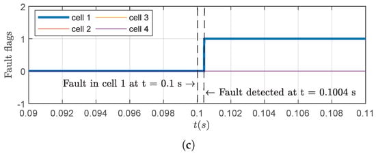 Performance of the proposed fault-tolerant algorithm (simulation results) with an open-circuit fault in a master (voltage-regulated) cell: (a) output voltage response; (b) current response; (c) per-cell fault detection flags.
