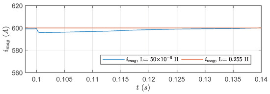 Figure 9 compares the behavior of the total output current or magnet current when the inductance values of the laboratory set-up (50 μH) and the actual HL-LHC quadrupole magnet circuit (0.255 H) are considered. According to the simulations, a noticeable output current transient occurs when considering the relatively low inductance value of the laboratory set-up (Figure 9, plotted in blue). This effect becomes almost negligible when the large inductance of the magnets is set in the simulation model (Figure 9, in red). In this case, a short perturbation of 1.5 mA is produced, which is below 1 ppm at rated current. This last result highlights the suitability of the fault-tolerant solution for the final magnet powering application.