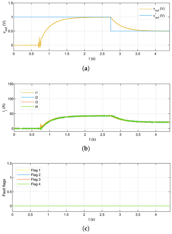 As an example, Figure 11 illustrates the performance of the power system during a start-up process, where the system is activated at around s, producing a step-up in , from 0 V to 1 V, and then a step-down, at around s, from 1 V to 0.5 V (blue line in Figure 11). Satisfactory voltage regulation (Figure 11a) and current balancing (Figure 11b) responses are simultaneously achieved, and no fault flag is raised in the steady state or during transients (Figure 11c).