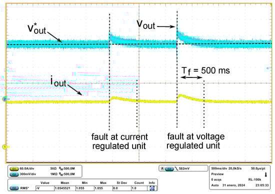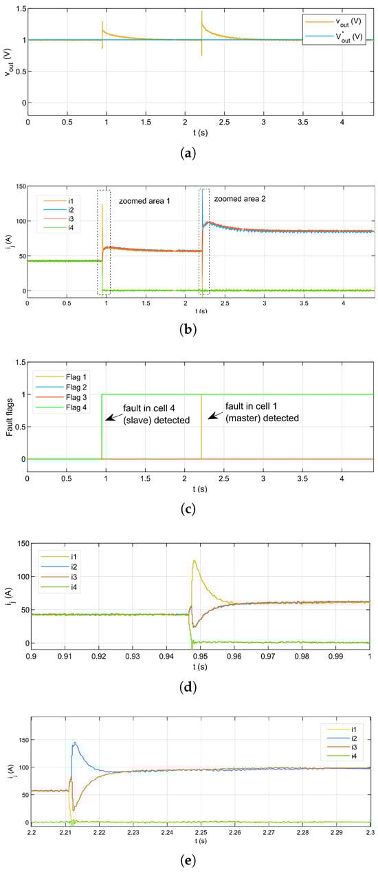 Figure 12 and Figure 13 experimentally exemplify the performance of the system when two consecutive faults are produced: a fault in a current-regulated slave sub-converter and a fault in the voltage-regulated master sub-converter. To emulate the open-circuit faults produced by hypothetical driver circuitry errors, the top side MOSFETs’ firing pulses of sub-converters 1 and 4 are manually disabled from the OPAL-RT system’s console.