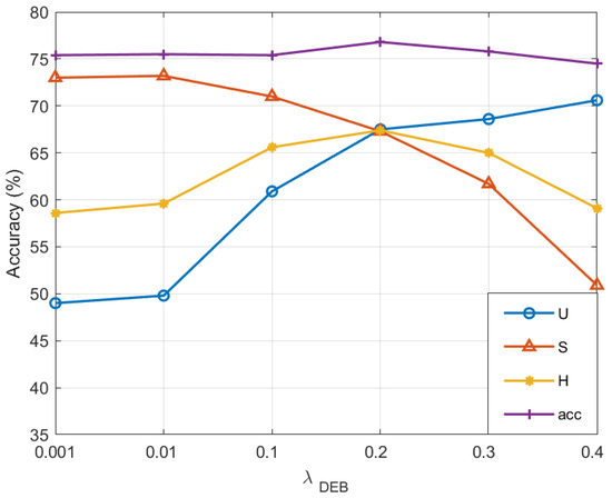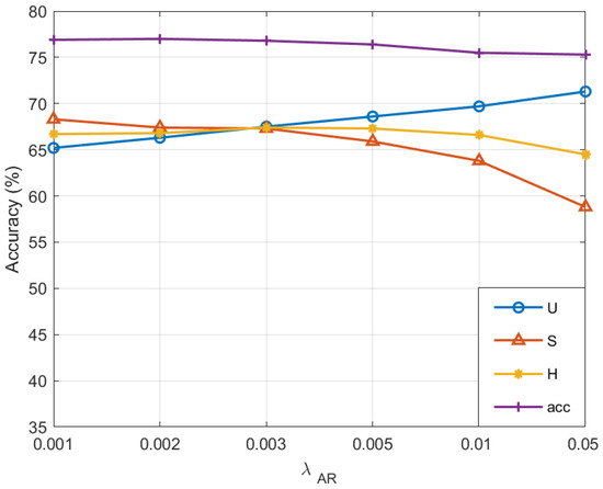 The impact of varying attribute regression loss weights, denoted as , is illustrated in Figure 2. The parameter quantifies the significance of the attribute regression loss in facilitating effective visual–semantic interaction for the model. It is designed to ensure the accurate prediction of object attributes within an image, including color, size, and shape. An extensive investigation of the values on the CUB dataset has been conducted, encompassing . With a low setting, the accuracy for unseen classes and the harmonic mean (H) tend to increase; this occurs because an overly small attribute regression loss does not sufficiently guide the model to learn attribute features, resulting in a suboptimal corrective influence on the model’s attribute prediction accuracy. At a high setting, the evaluation metrics are prone to decrease, as an overly large attribute regression loss leads to an excessive focus on the attribute regression task, overshadowing other critical loss functions. Taking into account the accuracies of U, S, and H collectively, the model achieves an optimal balance at , signifying that this value effectively mediates the learning process, neither disregarding the impact of other loss functions nor failing to efficiently direct the model towards attribute feature learning.