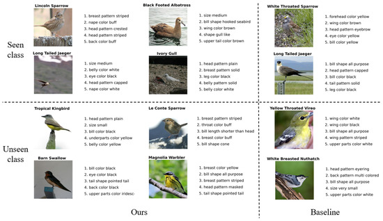 In addition to this, we conducted a comparison with the unaltered baseline model. The results revealed that, while some attributes exhibit correlation, there were instances of attribute descriptive errors. For example, in the case of the white-throated sparrow, one of the attribute descriptions stated ‘eye color yellow’, which is factually incorrect. This comparison serves as a compelling indication of the effectiveness of the improvements that we have implemented in our model.