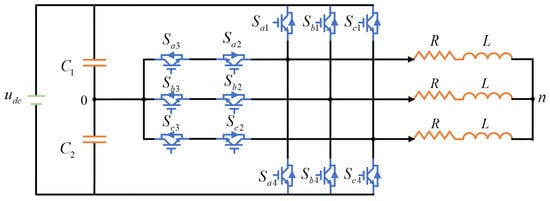 The three-level PWM converter is one of the most mature and widely used variable frequency devices in the industrial sector today. Its typical circuit configuration includes the three-level inverter topology of type t, as shown in Figure 1. Firstly, this study conducts a detailed analysis of the switching states of the t-type three-level inverter. Taking the converter’s phase as an example, the logical function of its switching state is defined as follows.