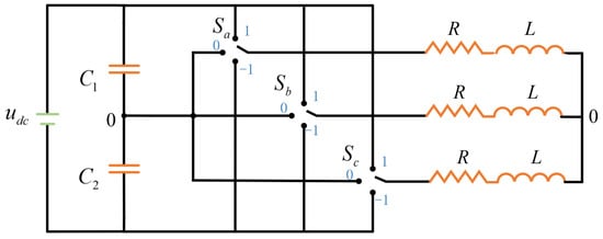 The switching states of phases b and c are similar to that of phase a. Thus, each phase in the t-type three-level ANPC topology has three switching states: P, O, and N. The entire converter can generate 27 distinct switching states, To further simplify the analysis, the t-type three-level topology shown in Figure 1 can be simplified to the structure depicted in Figure 2.