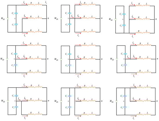 On the software side, inadequacies in modulation and control strategies also significantly affect the balance of the NPV [39,40]. As shown in Figure 2, the voltages of the capacitors on both sides of neutral point O are closely related to the current flowing through it. Assuming the impact of capacitor parameter differences on the NPV is negligible, the current flowing through the neutral point O directly influences the charging and discharging of the upper and lower capacitors, leading to fluctuations and subsequent imbalance in the NPV. In the simplified t-type three-level structure depicted in Figure 2, different switching states result in variations in the magnitude and direction of the current through the neutral point. A t-type three-level converter has 27 possible switching states, categorized into four types: large vector, medium vector, small vector, and zero vector. From these 27 states, this paper selects 9 representative switching states, with the current directions through the neutral point illustrated in Figure 3.