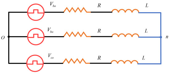 In the previous section, the issue of NPV deviation in t-type three-level converters was discussed. This section focuses on the problem of CMV and its causes. The generation of CMV is primarily associated with variations in the electromagnetic field around the equipment or circuit, coupling effects between parasitic capacitances, and design flaws in the circuit [41,42,43]. Similar to the issue of NPV deviation, CMV is an unavoidable phenomenon in three-level converters. CMV, along with the induced problems such as shaft voltage and bearing currents, poses significant threats to the normal operation of the system. Therefore, it is essential to implement effective measures to control and suppress CMV to ensure the reliability and stability of the system. Taking the t-type three-level converter as an example, to analyze the causes of CMV, it is first necessary to establish the equivalent circuit of the t-type three-level converter, as shown in Figure 4. The switching states of phases a, b, and c are represented by voltages , , and , respectively. Depending on the switching states, these voltage values can take one of three levels: , 0, or .