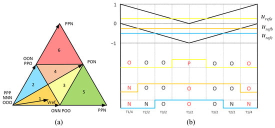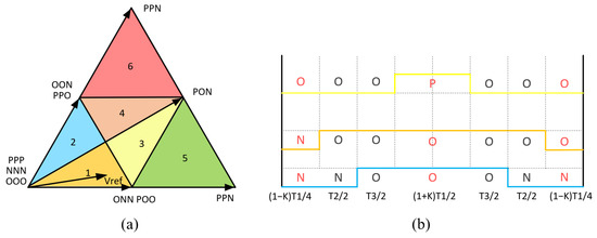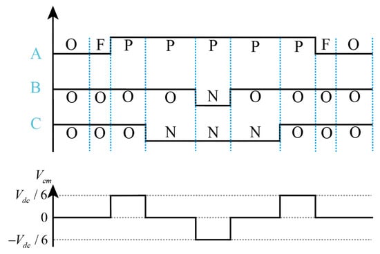 For the suppression of CMV, carrier-based modulation methods can effectively reduce the amplitude of CMV. By adjusting the switching patterns of the inverter or the generation of pulse-width modulation signals, carrier modulation achieves effective CMV suppression [71,72,73]. Reference [74] proposes a carrier-based CMV suppression method, primarily by adjusting the PWM pulse sequences of the back-to-back three-level neutral-point clamped converter, using carrier modulation techniques to eliminate CMV. Specifically, the method injects zero-sequence voltage into the PWM pulses of both the rectifier and inverter sides, ensuring that the voltage pulses on both sides are aligned during the switching cycle. This alignment allows the CMV generated on both sides to cancel each other out. Carrier modulation adjusts the position of the carrier signal to ensure alternating positive and negative voltage pulses, thereby reducing the amplitude of the CMV to zero. Reference [75] proposed a space vector modulation scheme for reducing CMV in a quasi-z-source three-level t-type inverter. As shown in Table 1, the CMV reaches its maximum value when the synthesized reference voltage corresponds to the small vector switching state. To address this, Reference [75] avoided the use of small vectors during the synthesis of the reference voltage and instead selected large vectors, medium vectors, and zero vectors for vector synthesis. Switch state sector diagram and effect of switch state on CMV in Figure 13, adopting a five-segment switching scheme with the sequence OOO-PON-PNN-PON-OOO. Under this approach, the CMV is suppressed to 0 for most of the switching period, with a maximum value of . This demonstrates that the method is highly effective in CMV suppression. However, the exclusion of small vectors prevents effective control of the NPV. Consequently, while CMV suppression is significantly improved, limitations remain regarding the balancing of the NPV.