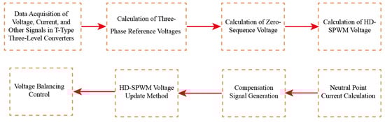 Reference [53] proposes a novel method combining zero-sequence voltage injection and dual-signal PWM to achieve NPV balance control under open-circuit fault conditions. This approach ensures that the three-level t-type inverter maintains NPV balance in fault scenarios through the integration of zero-sequence voltage injection and dual-signal PWM. First, zero-sequence voltage injection adjusts the three-phase reference voltages to fix the voltage of the faulty phase at zero, thereby maintaining the balance of the three-phase output voltages. Second, double signal PWM flexibly adjusts the duration of the zero level, providing additional degrees of freedom to control the neutral-point current, which in turn regulates the NPV. Without requiring additional hardware, this method achieves fault-tolerant control and NPV balance for the inverter, offering high practicality. Reference [54] introduces a new field-programmable gate array (FPGA)-driven high-definition sinusoidal pulse-width modulation architecture combined with a zero-sequence voltage injection strategy to address the issue of DC link capacitor voltage imbalance in clamped three-level neutral point inverters. This method dynamically balances voltages by combining the three-phase reference voltage signals with the voltages of the two DC-link capacitors and injecting zero-sequence voltage. The specific implementation is illustrated in Figure 7.