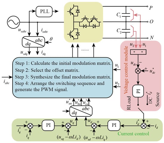Section 3 and Section 4 introduce methods for separately addressing the NPV balance and CMV issues. However, in practical applications, both NPV and CMV problems often coexist in three-level ANPC converters. The NPV and CMV in three-level converters exhibit significant coupling effects, and their interaction profoundly impacts the system’s stability, energy conversion efficiency, and electromagnetic compatibility. NPV imbalance leads to mismatched DC bus capacitor voltages, which affects the symmetry of the three-phase output voltage and introduces additional CMV components. Meanwhile, CMV suppression strategies typically rely on optimizing switching states to reduce transient fluctuations in the CMV, but this may alter the distribution of the neutral point current, exacerbating NPV deviations. Therefore, the converter control strategy design needs to consider the coordinated control of NPV and CMV to avoid the adverse effects caused by single optimization [83,84,85]. When addressing either CMV suppression or neutral-point potential balancing in isolation, the controller design is relatively straightforward. However, when both issues are considered simultaneously, the design of control strategies becomes more complex and challenging. Therefore, this chapter focuses on how to effectively maintain NPV balance while suppressing CMV.
